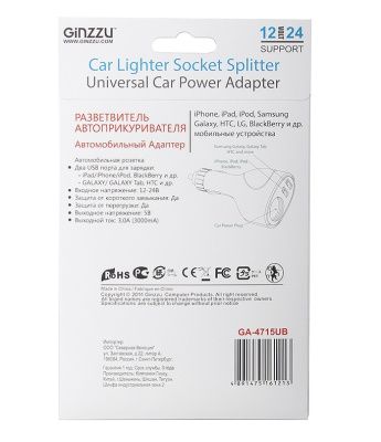Зарядное устройство автомобильное + две авто розетки Ginzzu GA-4615UB (АЗУ 5В/3.0A, 2USB, 2 авто-розетки + удлинитель 80см) [ GA-4615UB ]